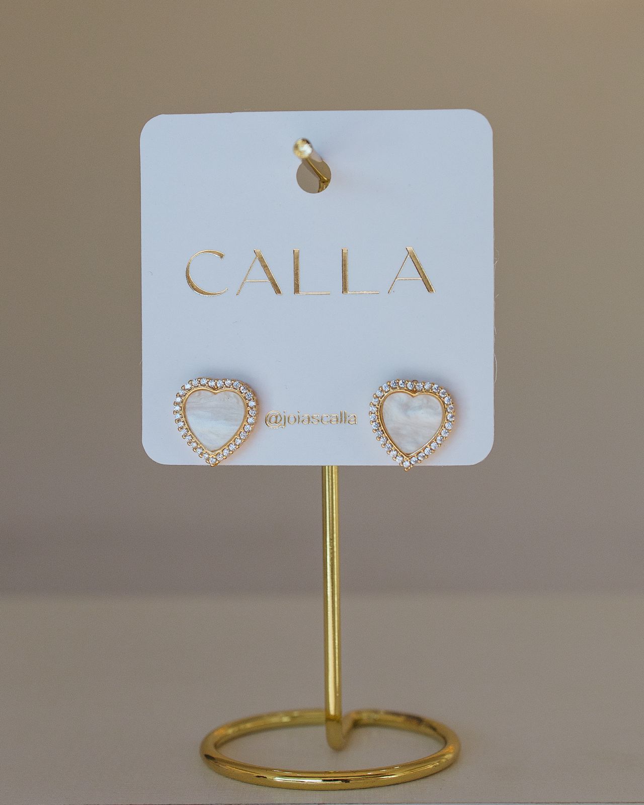 Brinco coração madrepérola cravejado; Com tarraxa; banhado a Ouro 18K.