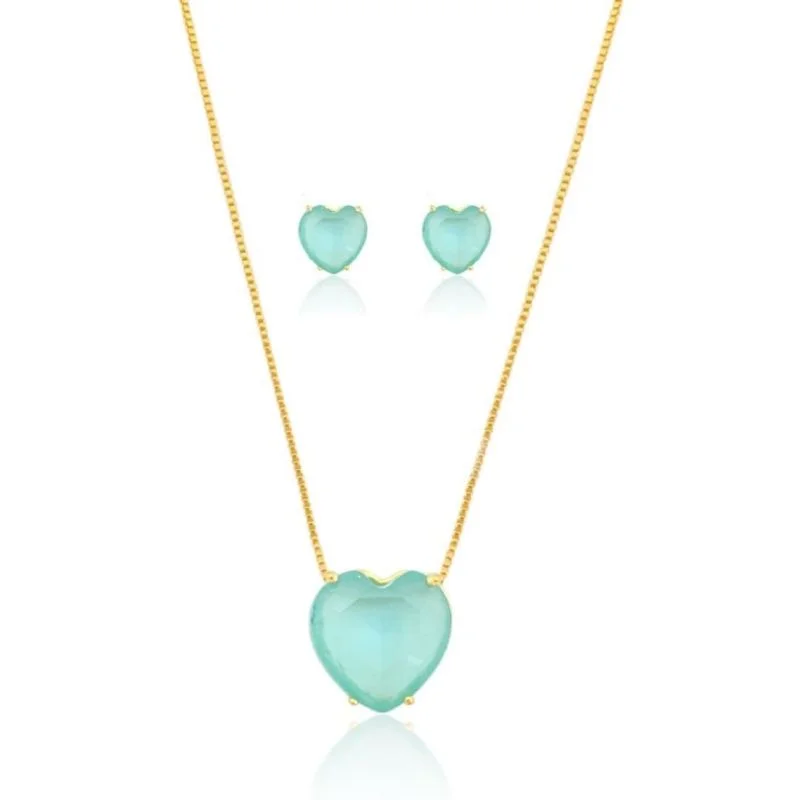 CONJUNTO CORACAO PEDRA AZUL BANHADO A OURO 18K